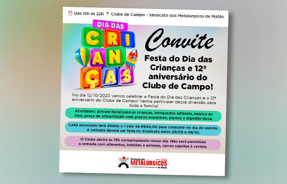 Festa do Dia das Crianas e o 12 aniversrio do Clube de Campo!26/09/2025 No dia 12/10/2025, das 15h s 22h, vamos celebrar juntos a Festa do Dia das Crianas e o 12 aniversrio do Clube de Campo! ✨Ser um dia inesquecvel com muitas atraes: pintura facial para as crianas, brinquedos inflveis, msica ao vivo, praa de alimentao com preos populares, pipoca e algodo-doce. Cada associado ter direito a um vale de R$40,00 para consumir no dia, com retirada no Sindicato entre 29/09 e 08/10. Traga sua famlia e venha participar dessa diverso especial! ❤️ • Veja outras informaes |