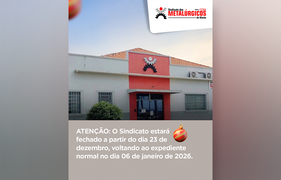 O Sindicato dos Metalrgicos de Mato entrar em recesso a partir do dia 23 de dezembro, retornando s atividades no dia 06 de janeiro de 2026.